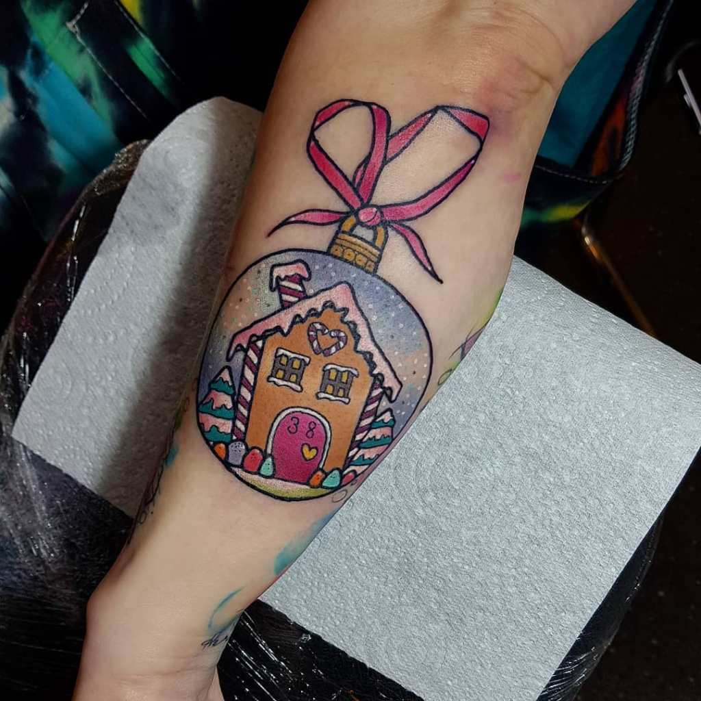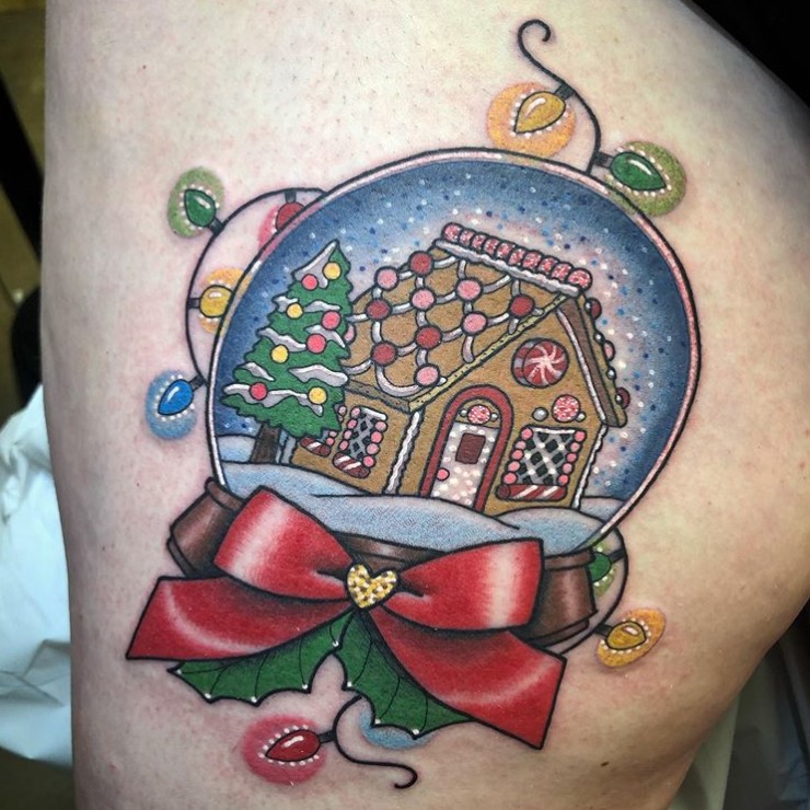 Gingerbread house snow globe tattoo by @pixierobsontattoo