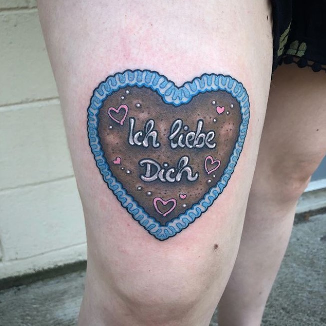 Ich Liebe Dich. Lebkuchenherz (gingerbread) tattoo by @kadehydrated