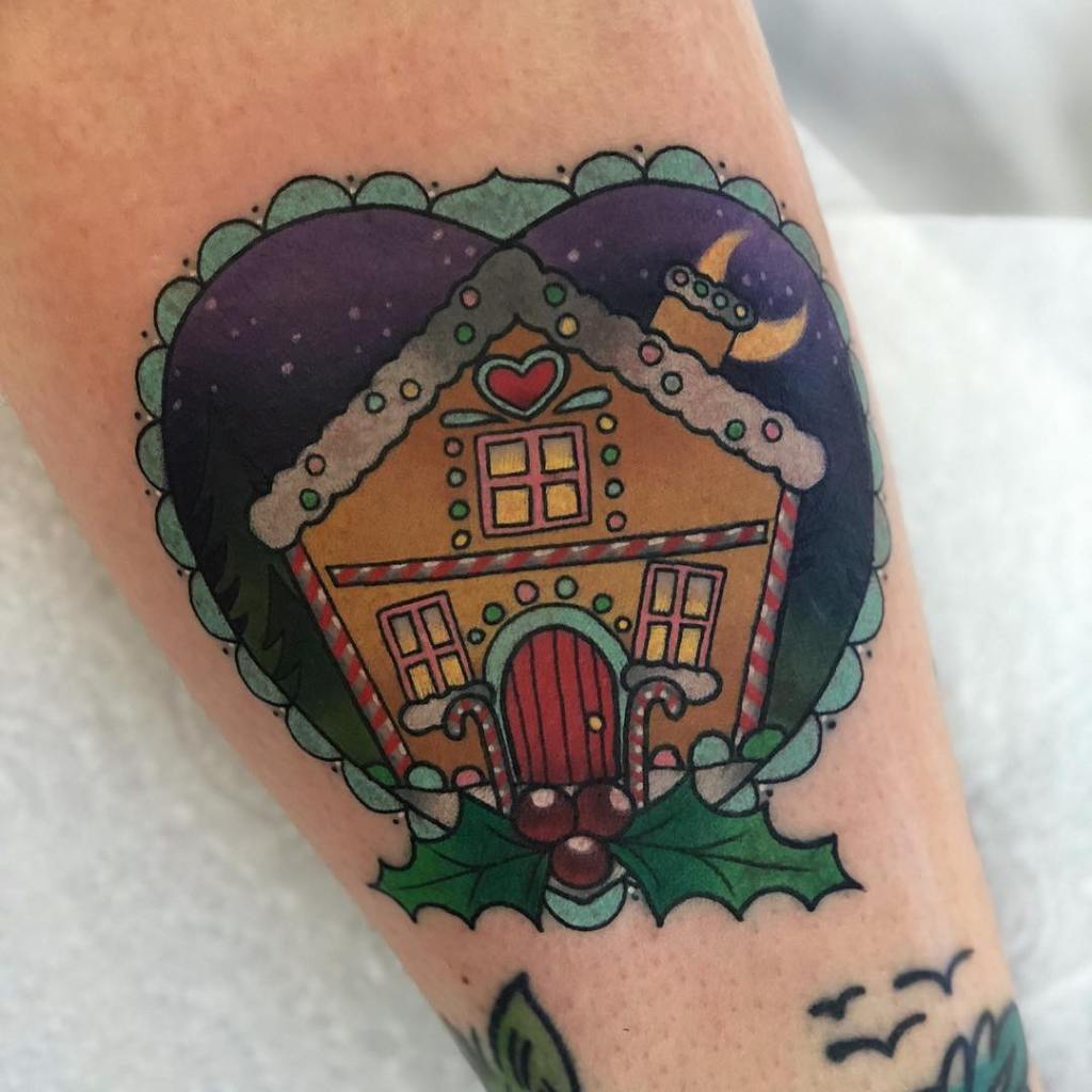 Gingerbread house and decorative love heart tattoo by @alexrowntreetattoo