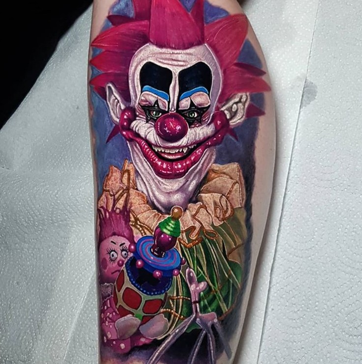 Killer Klowns from Outer Space has such colourful and creative sets and costumes for the Klowns, a stark difference to many other franchises where the villains wear dark clothing and stalk their victims in the dark of night. You could settle on a black and grey or a full-on blackwork piece for your tattoo, but this certainly could be your opportunity to go all out with the whole spectrum of colour.