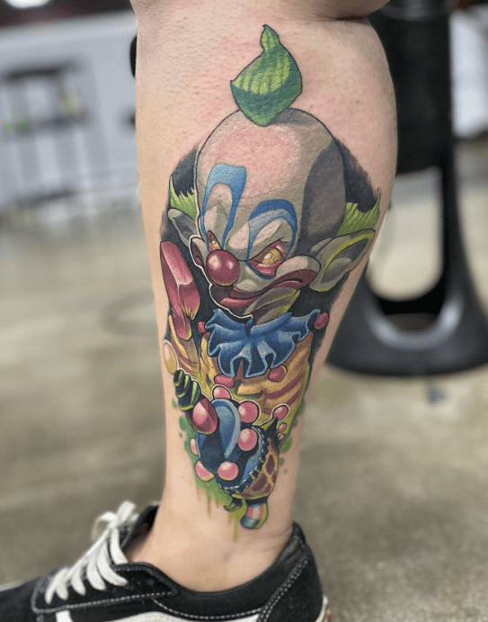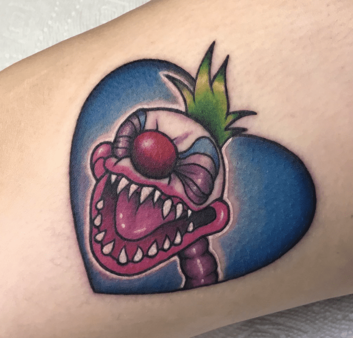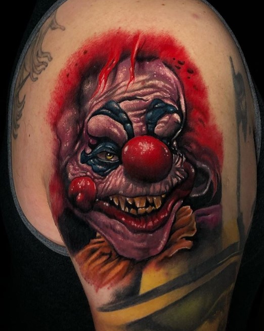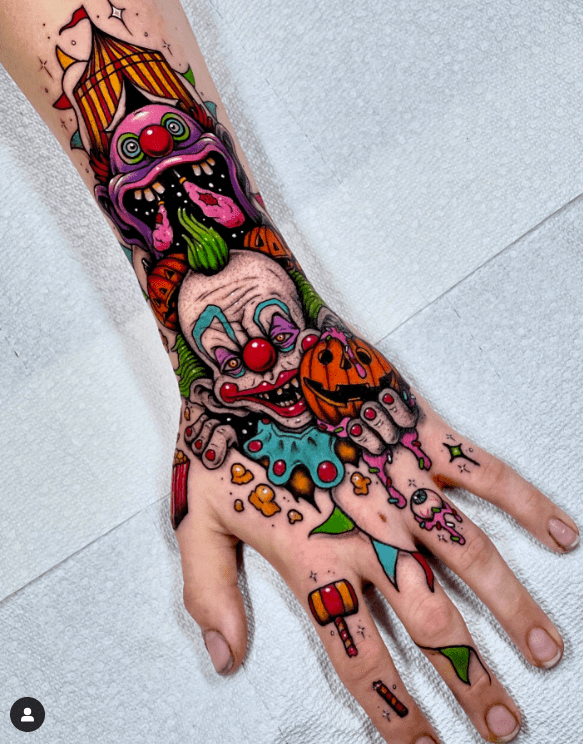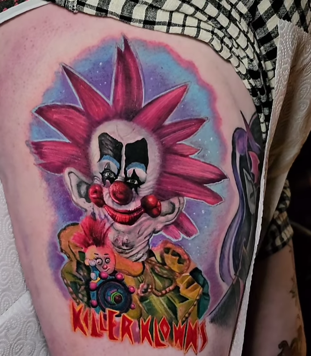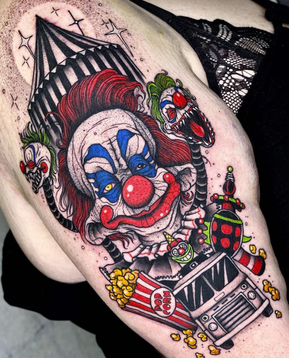 Killer Klowns from Outer Space has such colourful and creative sets and costumes for the Klowns, a stark difference to many other franchises where the villains wear dark clothing and stalk their victims in the dark of night. You could settle on a black and grey or a full-on blackwork piece for your tattoo, but this certainly could be your opportunity to go all out with the whole spectrum of colour.