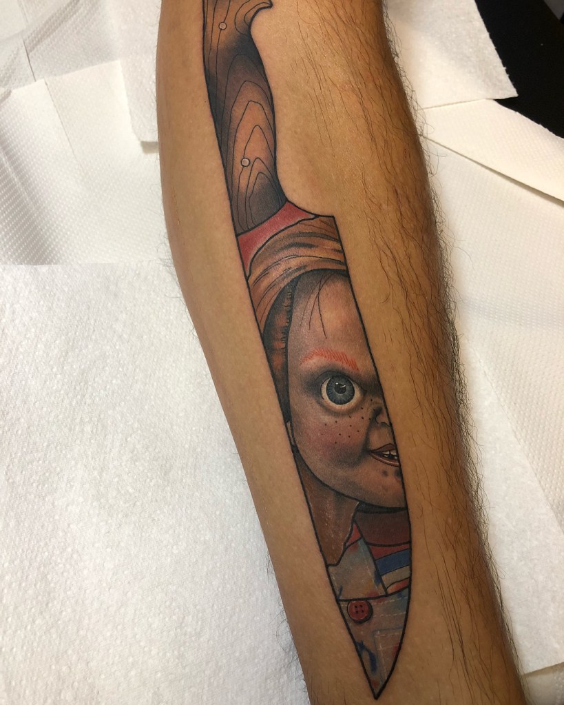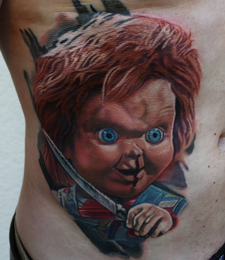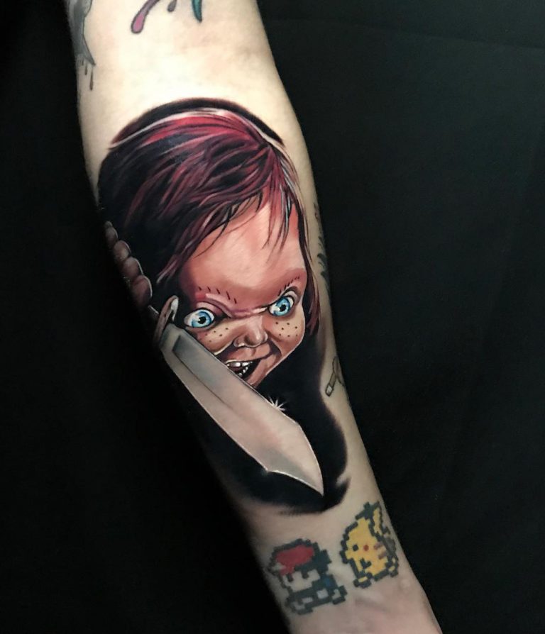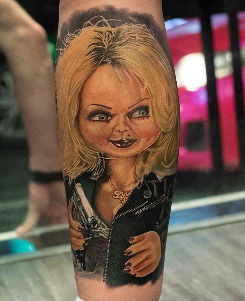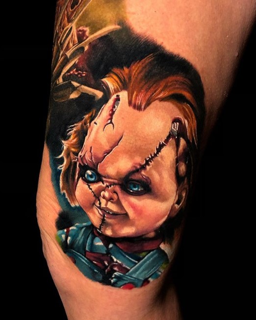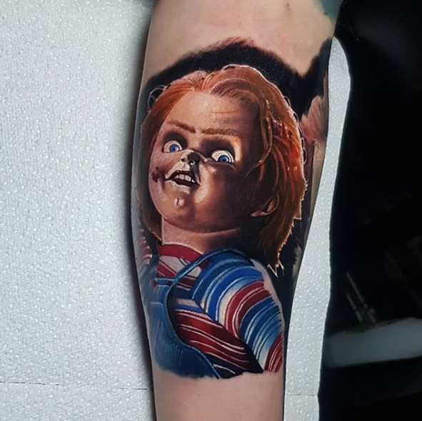 Painterly colour realism Child’s Play 3 tattoo by @vyacheslavbodrov