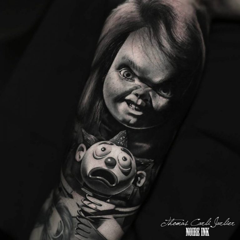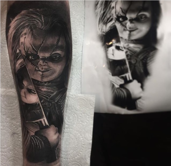 Dark trash realism Chucky tattoo by @anrijsstraume
