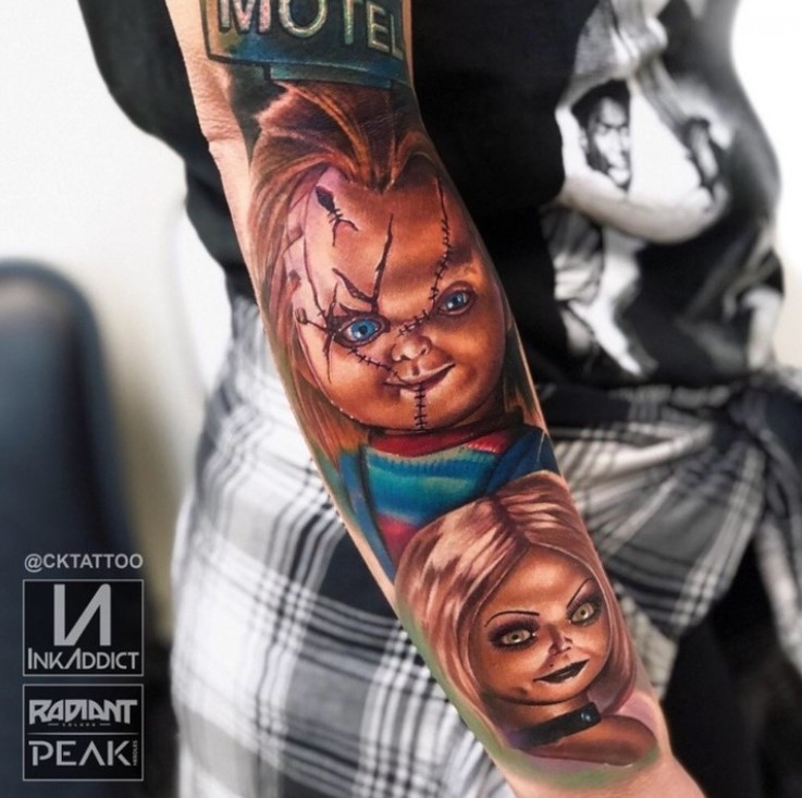 Colour realism Chucky and Tiffany tattoo by @cktattoo