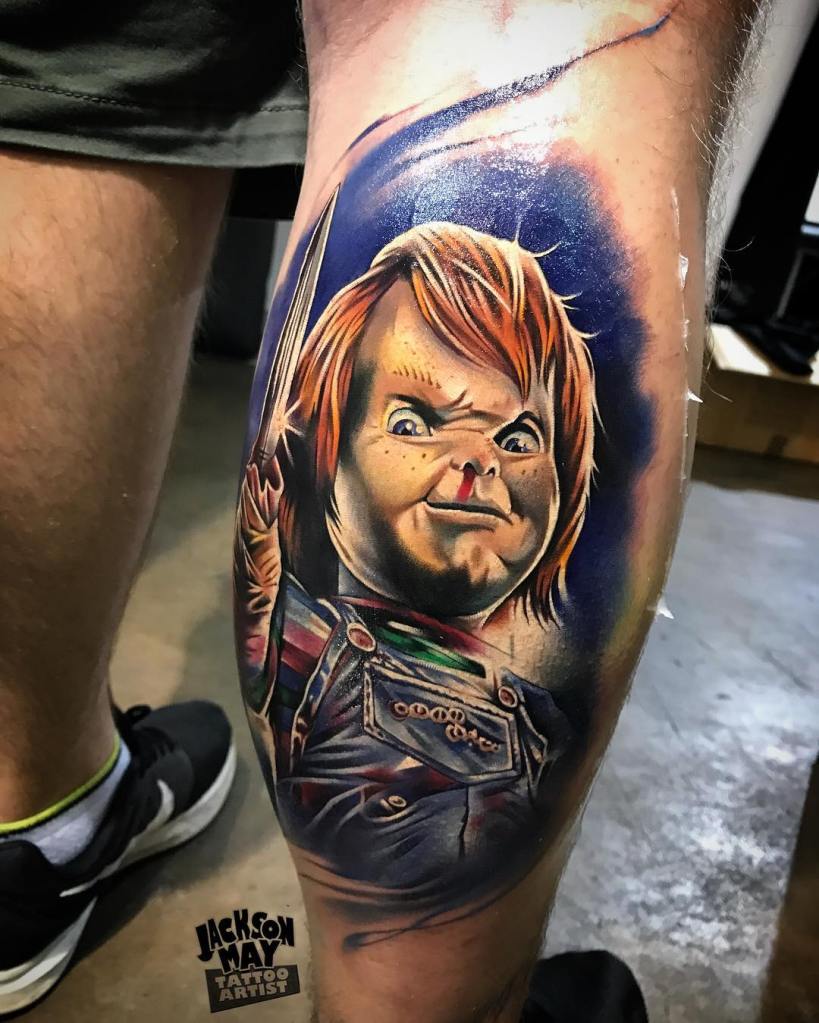 Stylised colour realism Chucky tattoo by @jacksonmay_tattooist