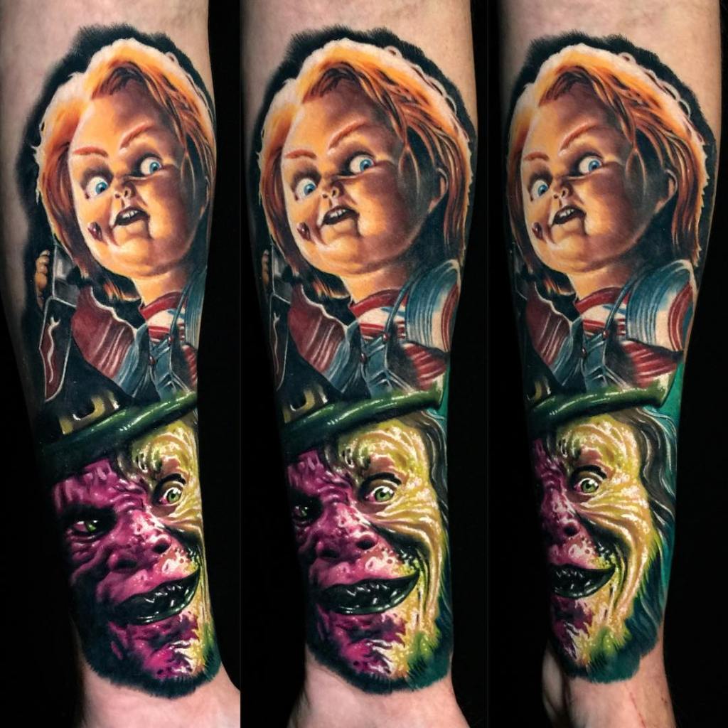 Healed Chucky and Tiff tattoo by @gavinhacketttattooer
