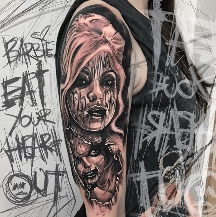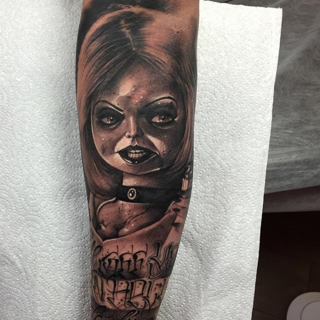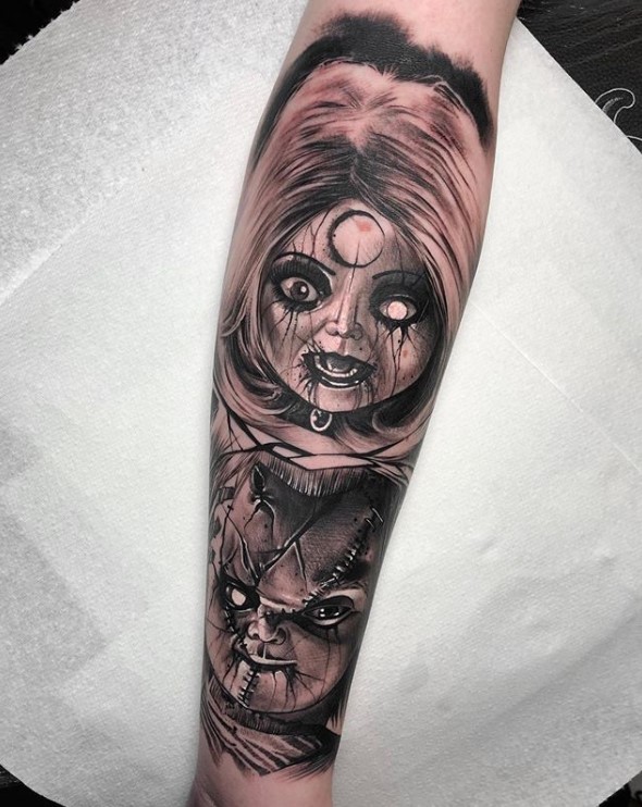 Dark trash realism Tiffany and Chucky tattoos by @anrijsstraume