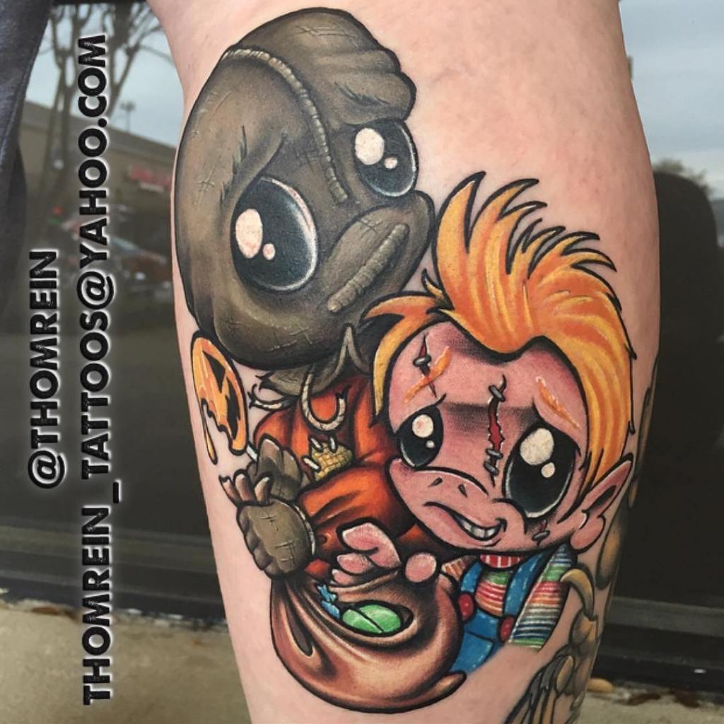 New school Sam (Trick ‘r Treat) and Chucky (Child’s Play) tattoo by @thomrein