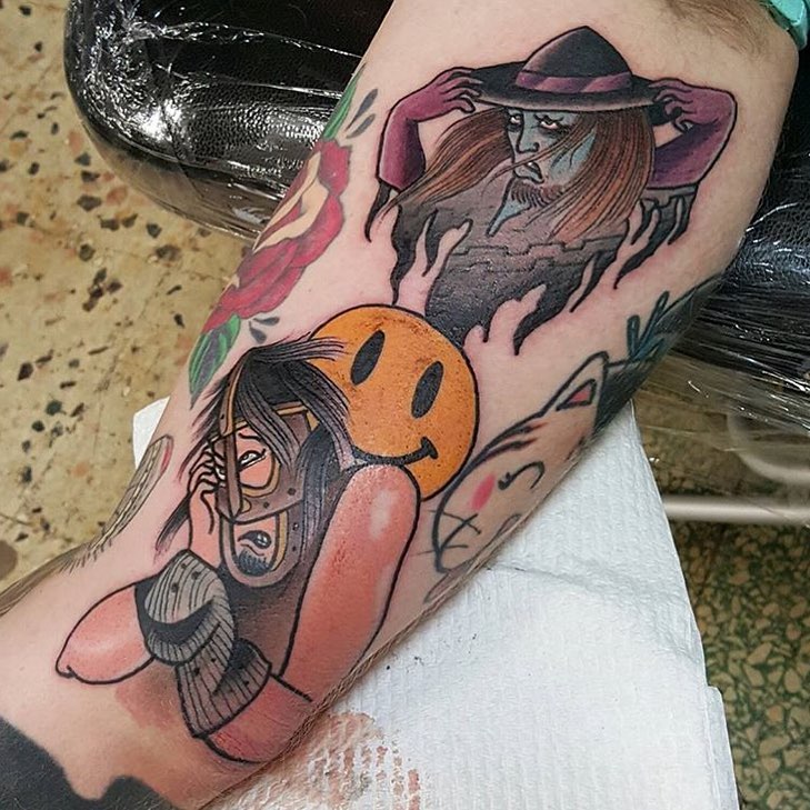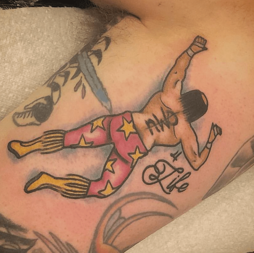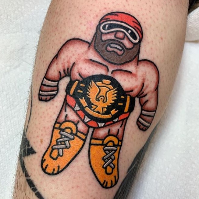 I love a good mash up tattoo, especially when it’s two things that couldn’t be any more different from one another: wrestling and children’s animation.
