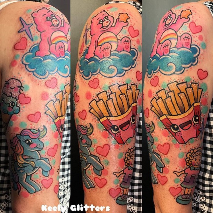 Cute and sparkly Care Bear, My Little Pony, fries and Polly Pocket tattoo by @keelyglitters