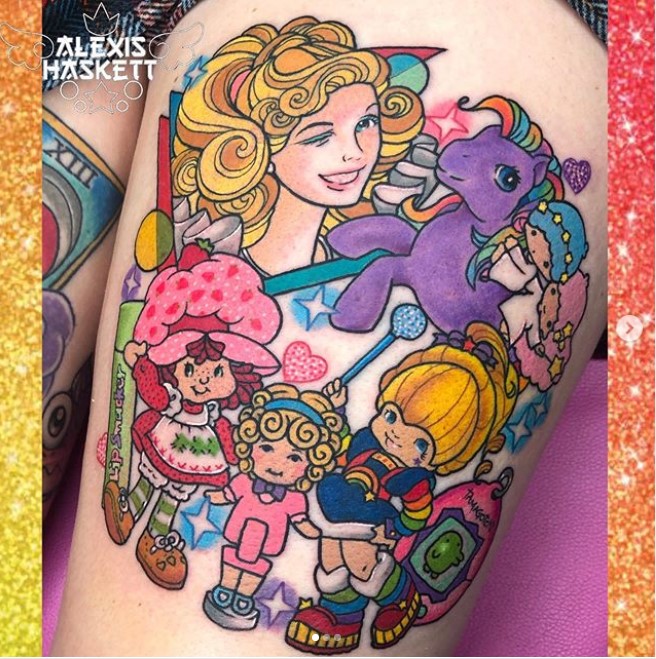 Lip Smacker, Strawberry Shortcake, Rainbow Brite, Polly Pocket, Tamagotchi, My Little Pony, Barbie and Little Twin Stars tattoo by @kawaii_tattoo