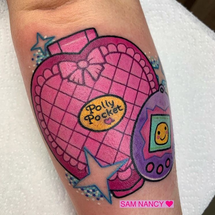 Polly Pocket and Tamagotchi tattoo by @sam.nancy.tattoos