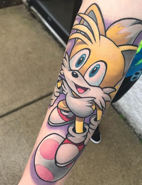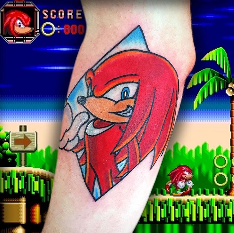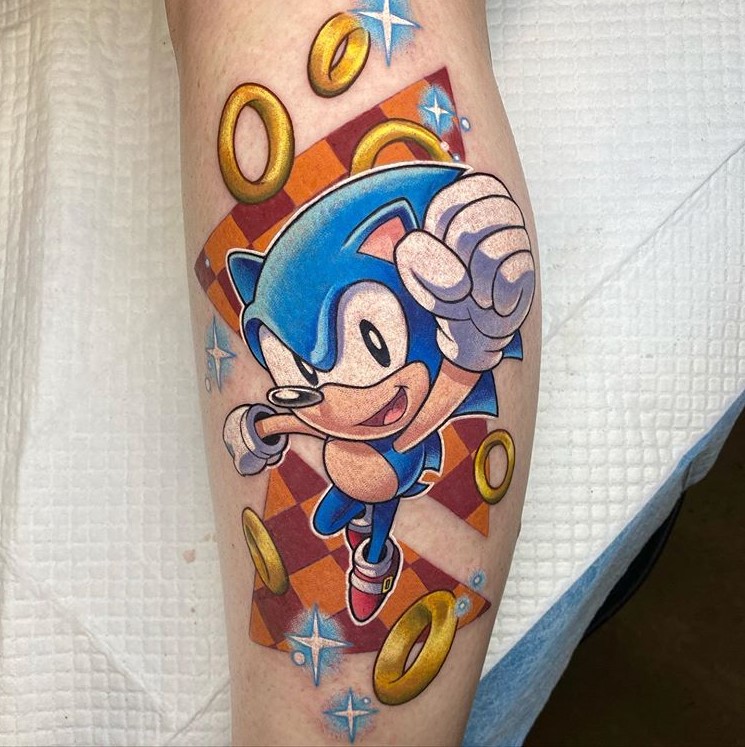 Over the years, more characters have been added to the Sonic franchise to either assist or prevent Sonic from achieving the games’ goals. Tails, a two-tailed kitsune (fox), was introduced as Sonic’s sidekick in Sonic the Hedgehog 2. Knuckles the echidna first appeared in Sonic the Hedgehog 3 and was initially an enemy before befriending Sonic and Tails. Sonic CD for Sega CD saw two new additions: Amy Rose, a pink female hedgehog and Sonic’s self-appointed girlfriend, and Metal Sonic, an evil robotic version of Sonic created by Doctor Eggman. There are even more characters than I’ve mentioned here, all of which would make excellent tattoos.