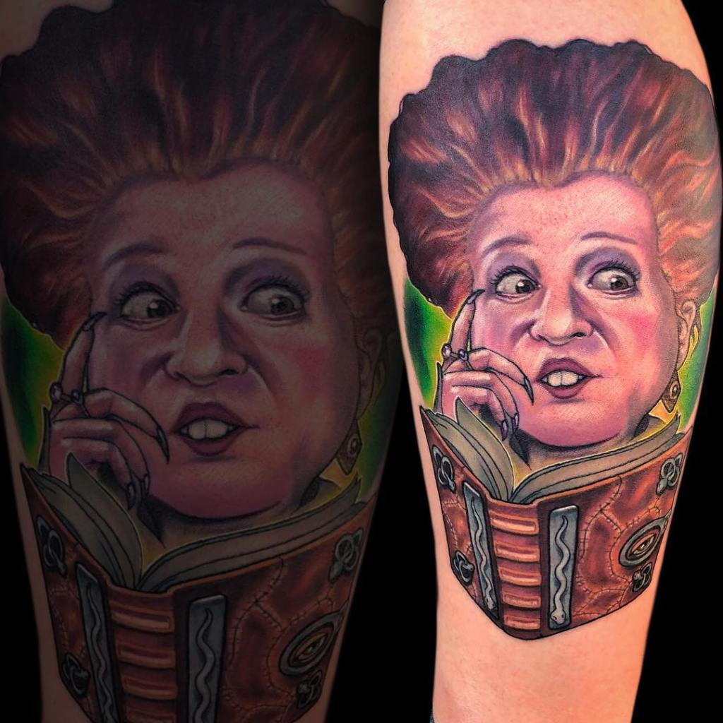 Colour realism Winifred Sanderson and Book of Spells tattoo by @kevinboudreau_
