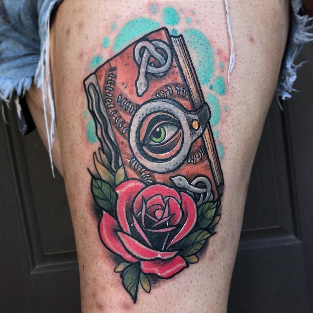 Neo trad Book of Spells and rose tattoo by @codydresser