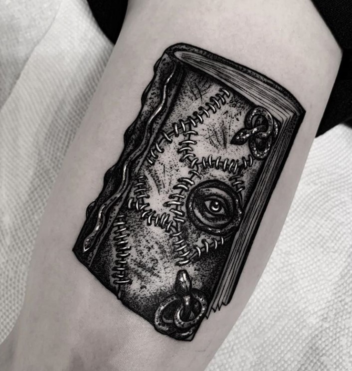 Blackwork Book of Spells tattoo by @mattwmurray