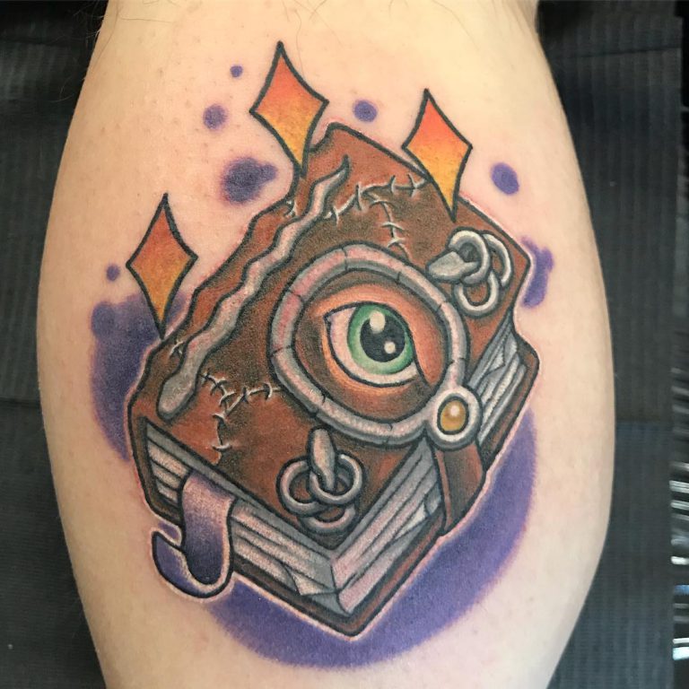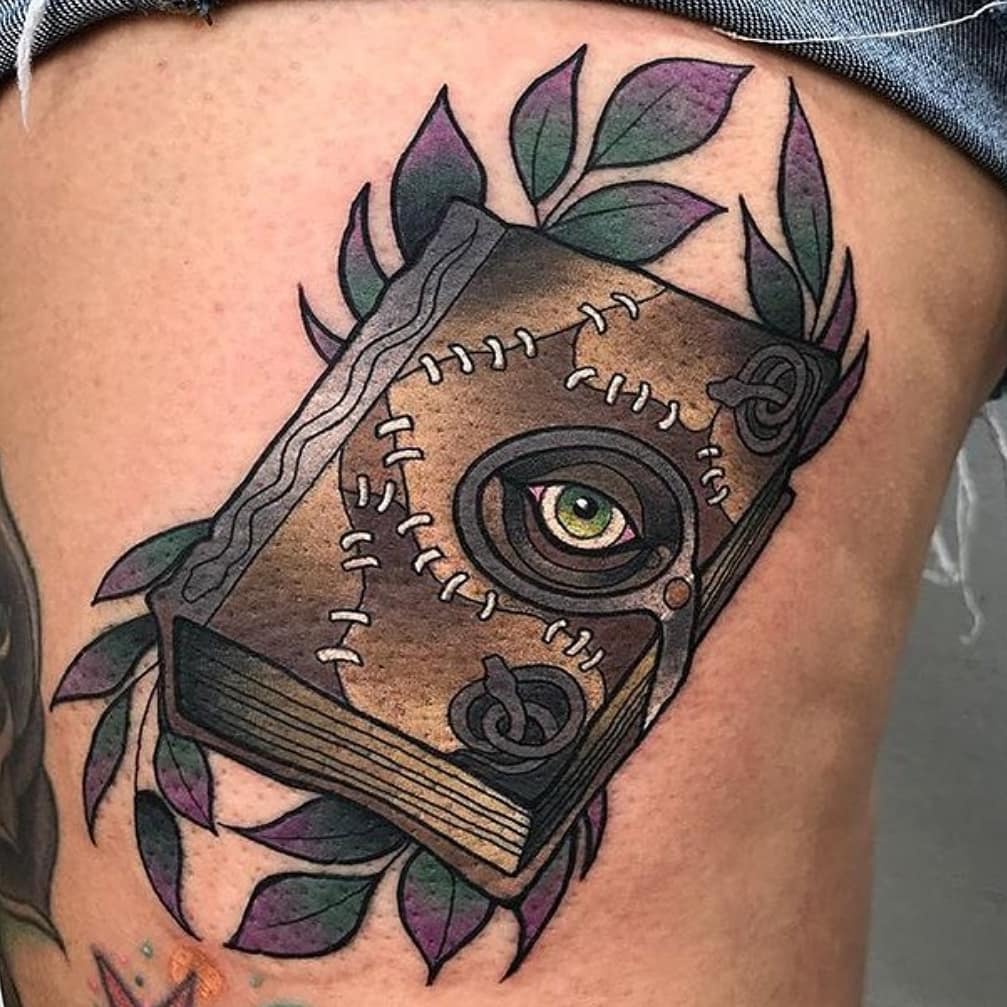 Neo trad Book of Spells tattoo by @jodydawber