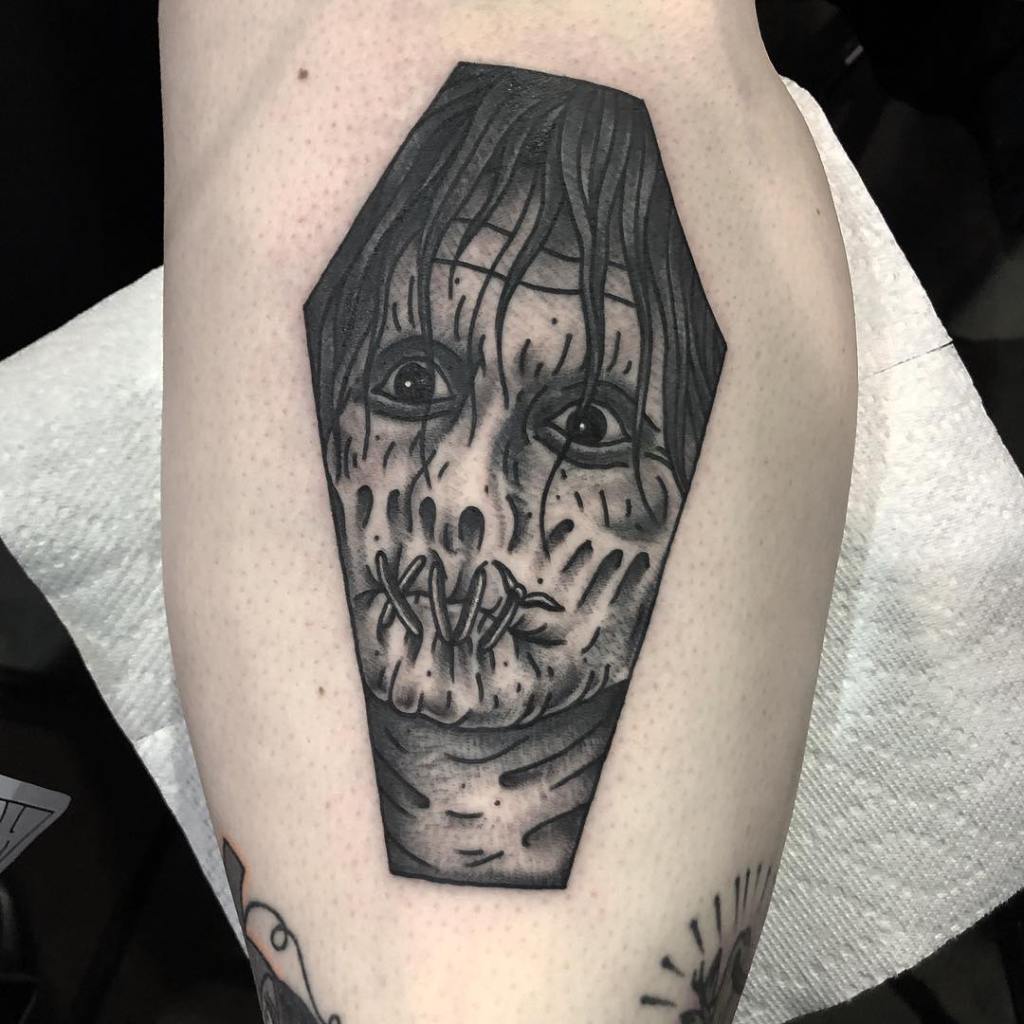 Black and grey traditional Billy Butcherson coffin tattoo by @angeloparente