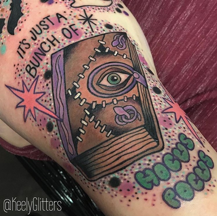It’s just a bunch of Hocus Pocus” Book of Spells tattoo by @keelyglitters