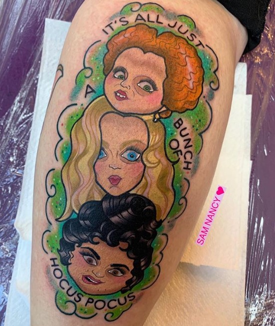 Sanderson sisters tattoo by @sam.nancy.tattoos – inspired by the artwork of @queenie_pocketfullofposiez