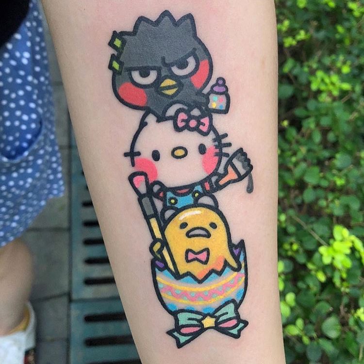 Badtz Maru, Hello Kitty and Gudetama tattoo by @coolcoolpikka