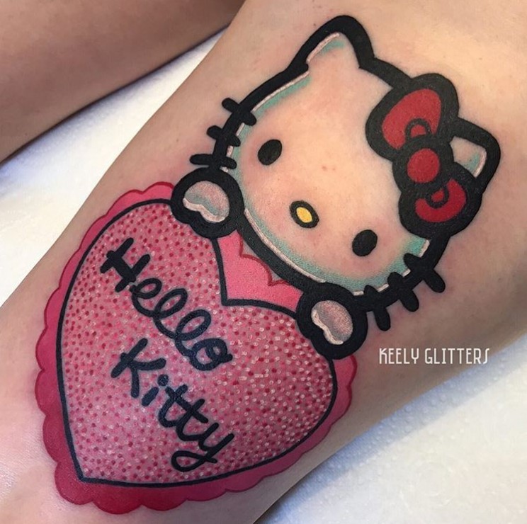 Bold Hello Kitty and sparkly love heart tattoo by @keelyglitters