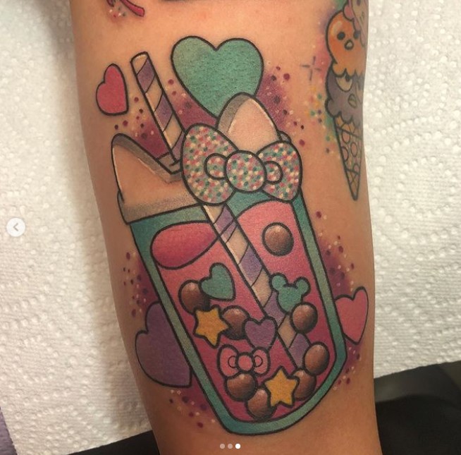 Hello Kitty (and hidden Mickey) boba tea tattoo by @alexstrangler