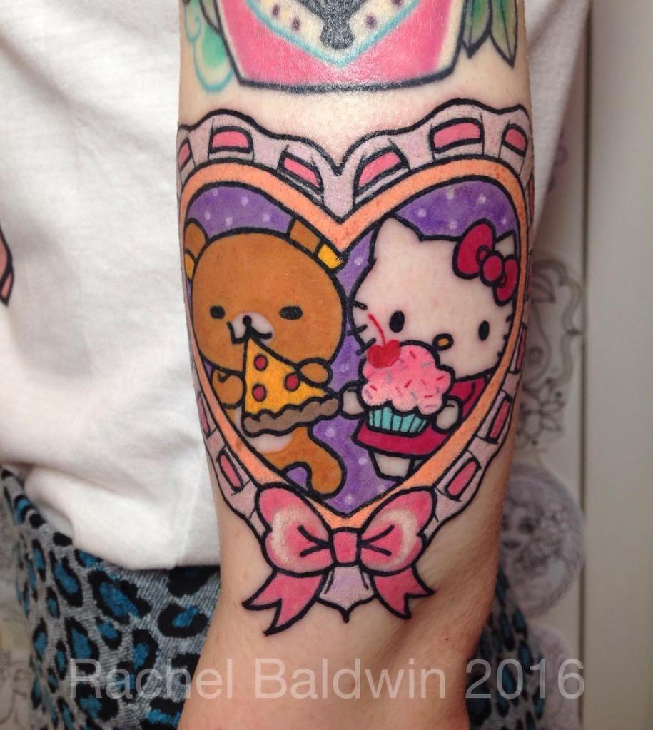 Rilakkuma and Hello Kitty decorative love heart tattoo by @rachelbaldwintattoo