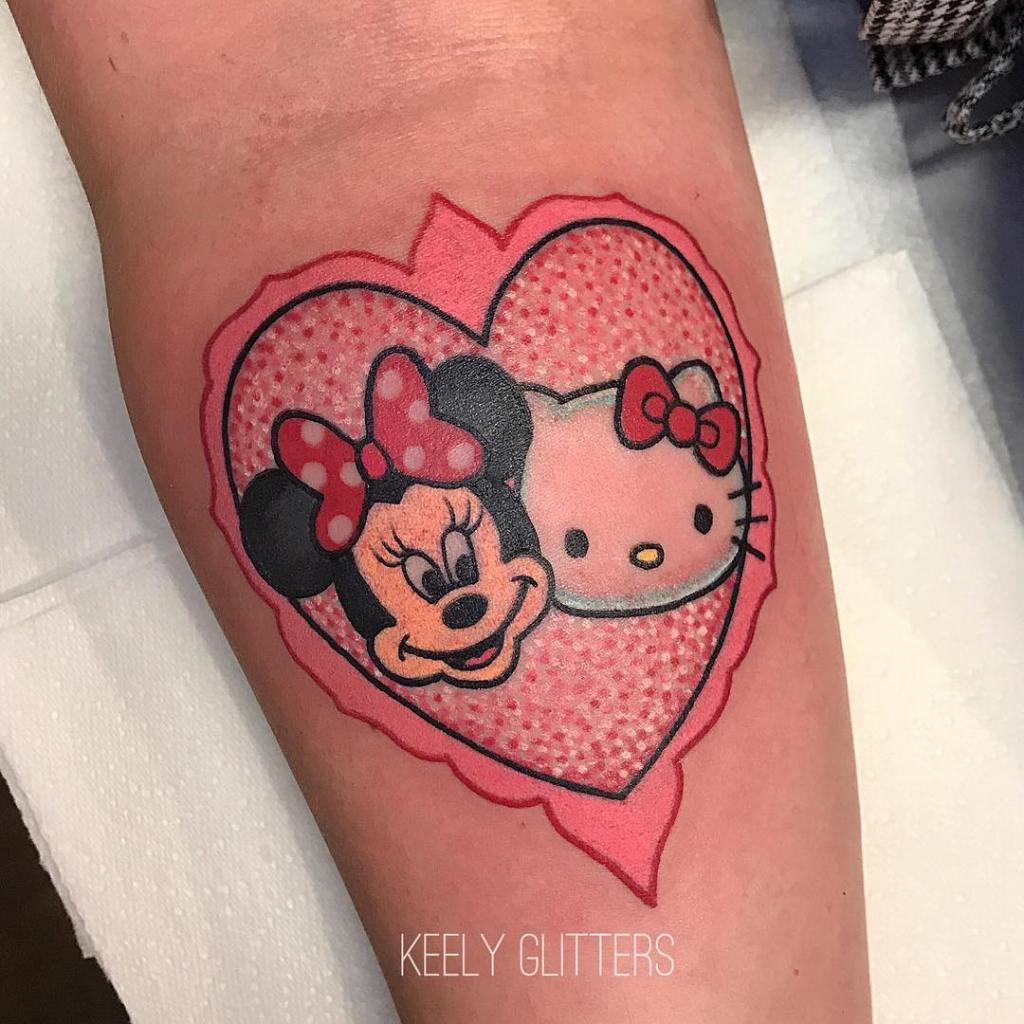 Minnie Mouse and Hello Kitty sparkly pink love heart tattoo by @keelyglitters