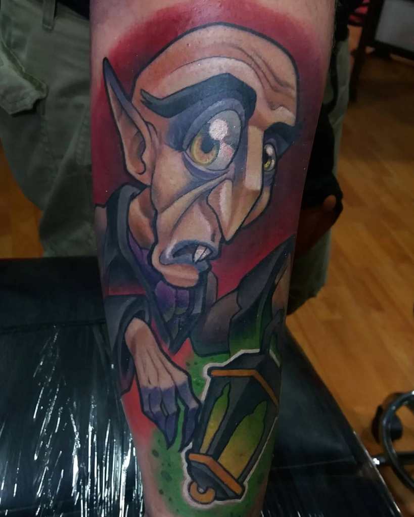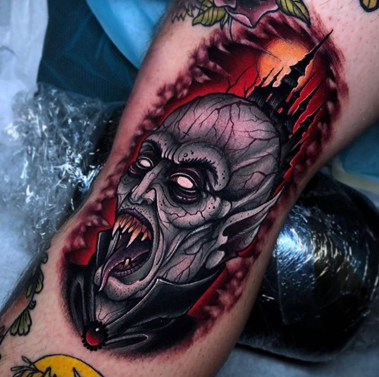 Colour realism Count Orlok (Nosferatu) leg tattoo by @armandean