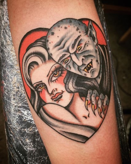 Traditional style Count Orlok (Nosferatu) love heart tattoo by @iamjimmyjam