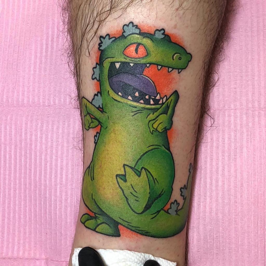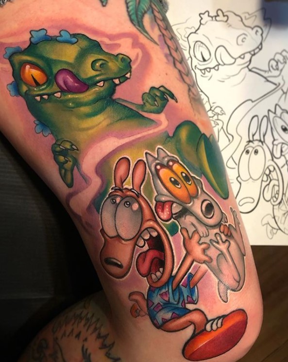 New school Reptar (Rugrats) and Rocko’s Modern Life tattoo by @joshhermantattoo