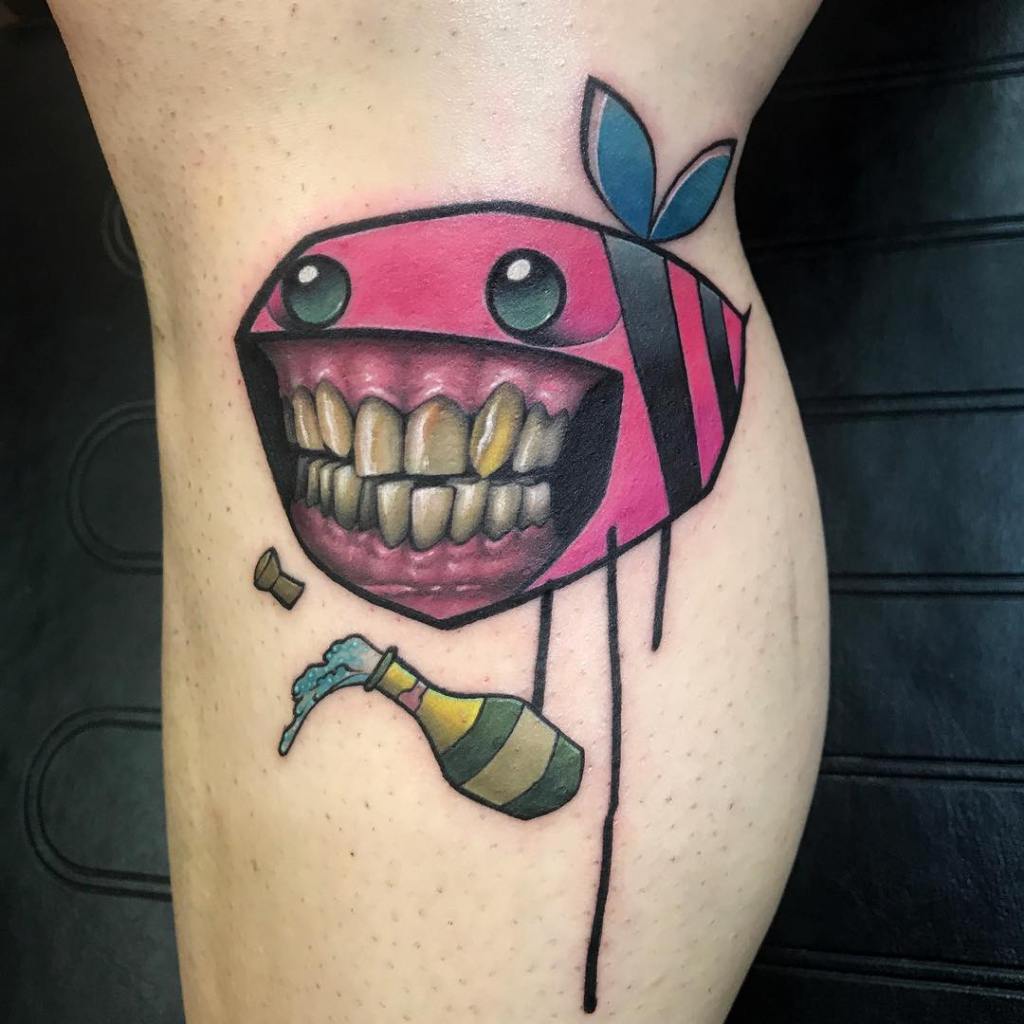 The stark contrast between the bold outlines of the brightly coloured critters, and the realistic style of the teeth is what make these tattoos exceptionally strange and unique to Josh Peacock.