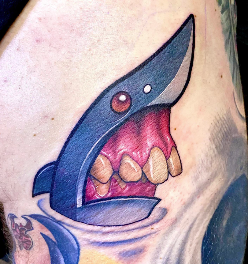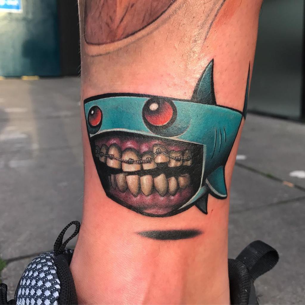 Shark with braces creepy critter tattoo by @joshpeacock_obe1
