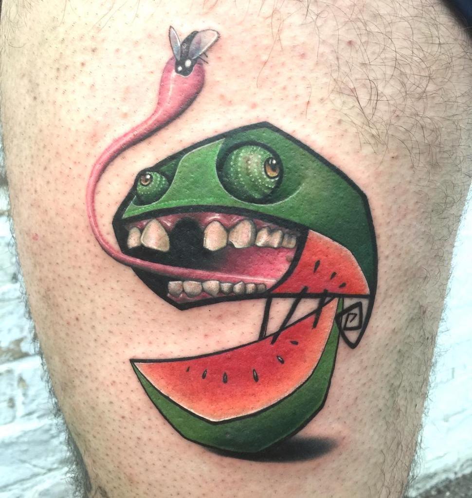 Watermelon chameleon creepy critter tattoo by @joshpeacock_obe1