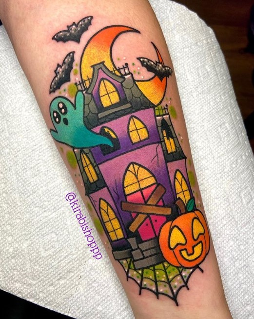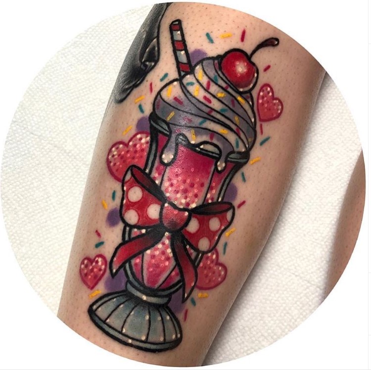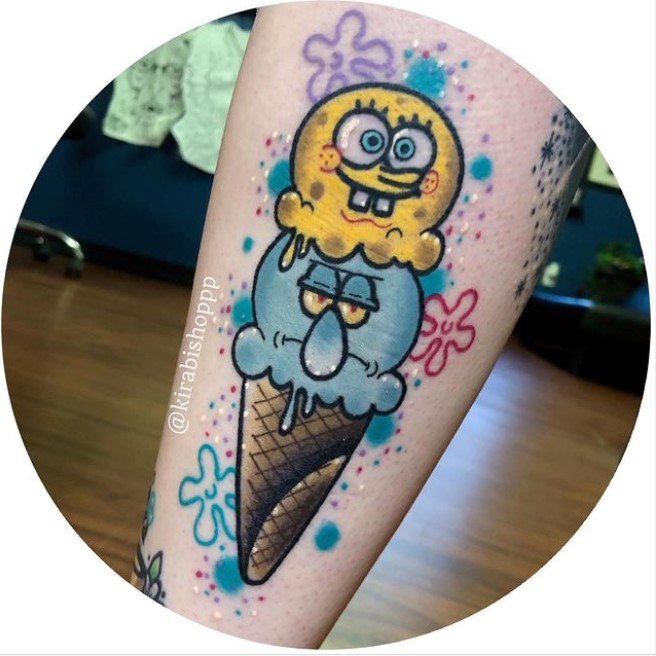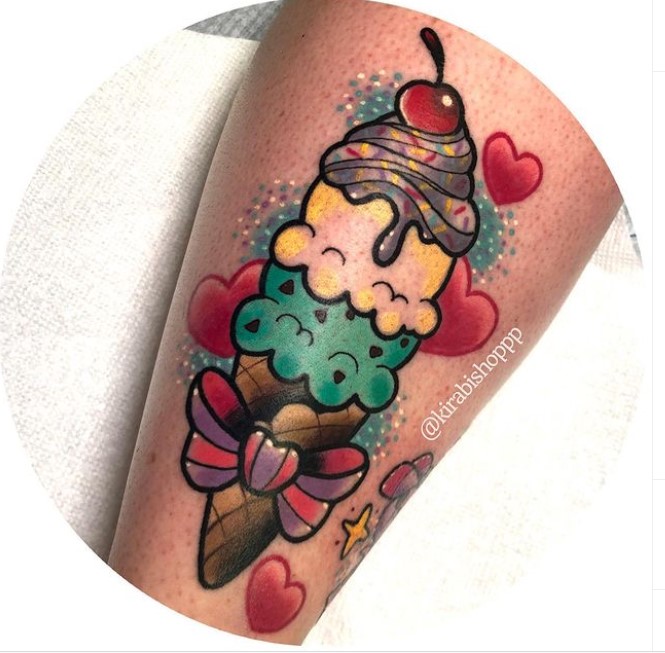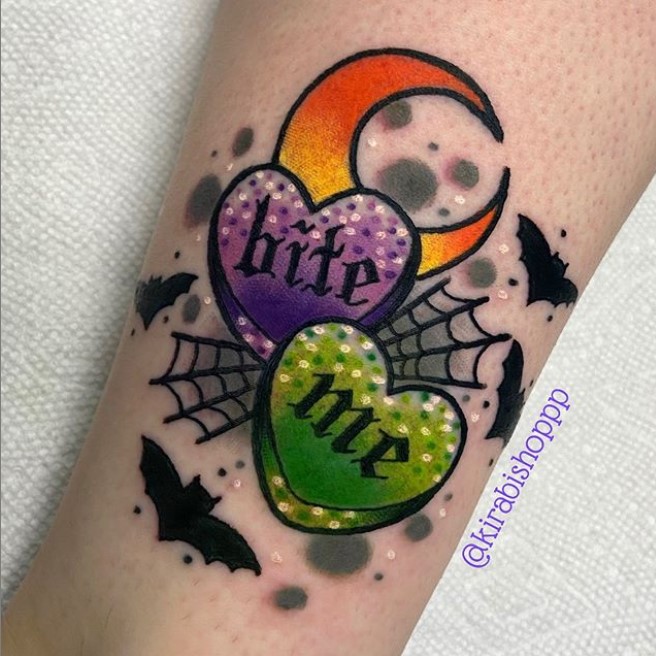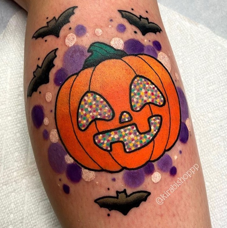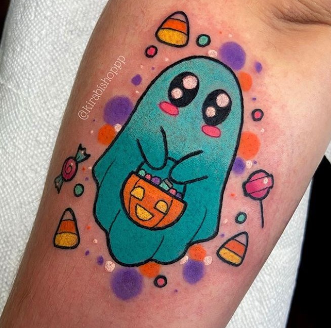 Co-owner of at Snake Eyes Tattoo in Austin, Texas, Kira Bishop describes her tattoos as ‘bubblegum traditional’ which is a term that really encapsulates everything about her style. The bold lines, shading and colour saturation are borrowed from traditional techniques, but applied to spoopy, kawaii and pop culture, with the addition of decorative elements to add more flair.