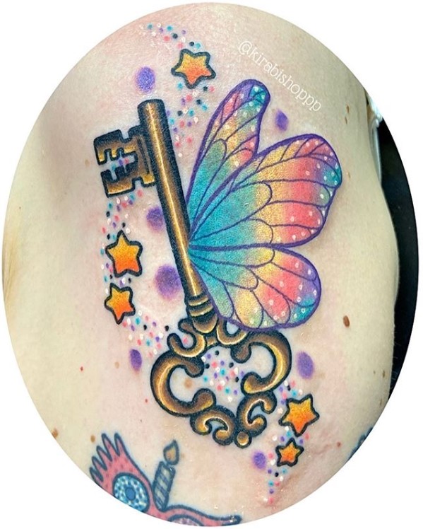 Tattoo glitter is not an easy decorative element to master despite them being just dots of ink. Bishop has an eye for the right combination of colours and the number and placement of the dots to add just the right about of sparkle.