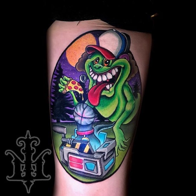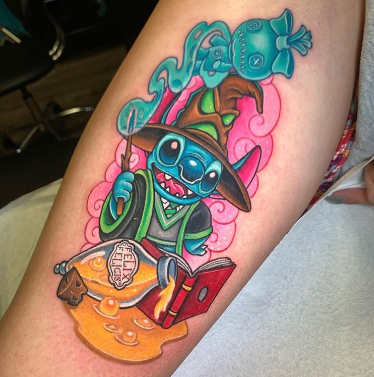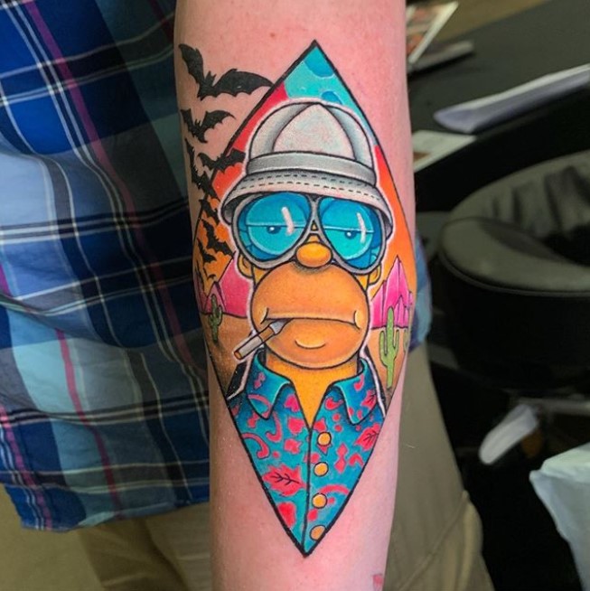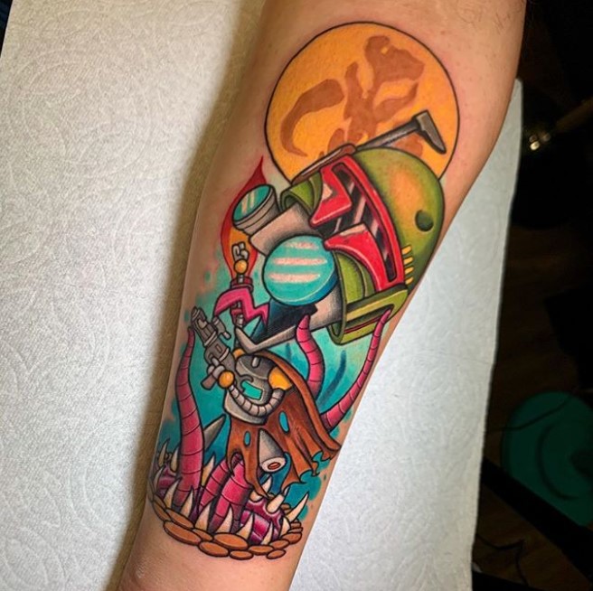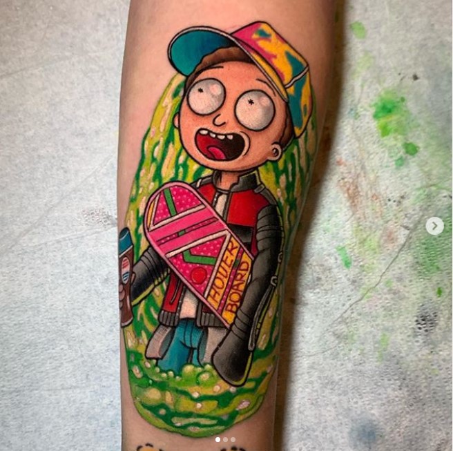 Jon Leighton is the owner of Fallen Crow tattoo in Murrieta, California where he produces bold pop culture tattoos with flawless colour saturation. In his Instagram feed you’ll find tattoos from a wide variety of fandoms such as Star Wars, Disney, animation (Nickelodeon, The Simpsons), Rick and Morty, along with some Halloween themed pieces, and even characters as popsicles.