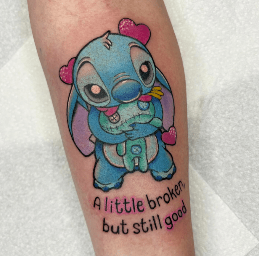 “A little broken but still good” Stitch tattoo by @abbiehoskintattoo