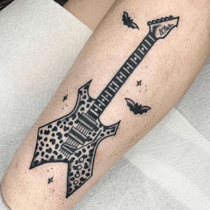 Black and grey Eddie Munson’s (Stranger Things) guitar tattoo by @abbiehoskintattoo