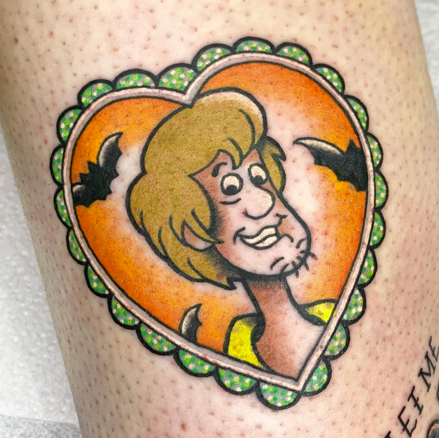 Decorative Shaggy (Scooby Doo) love heart tattoo by @abbiehoskintattoo