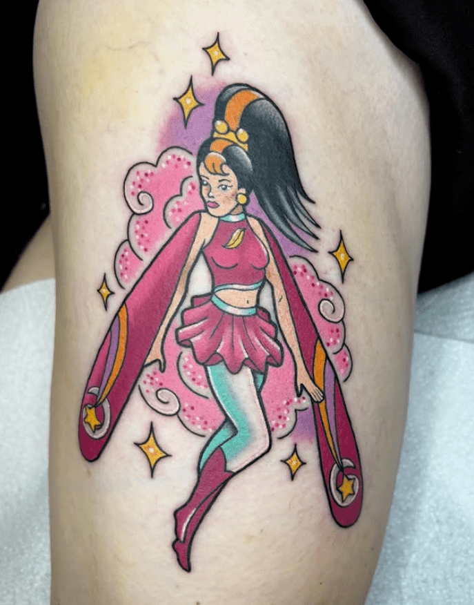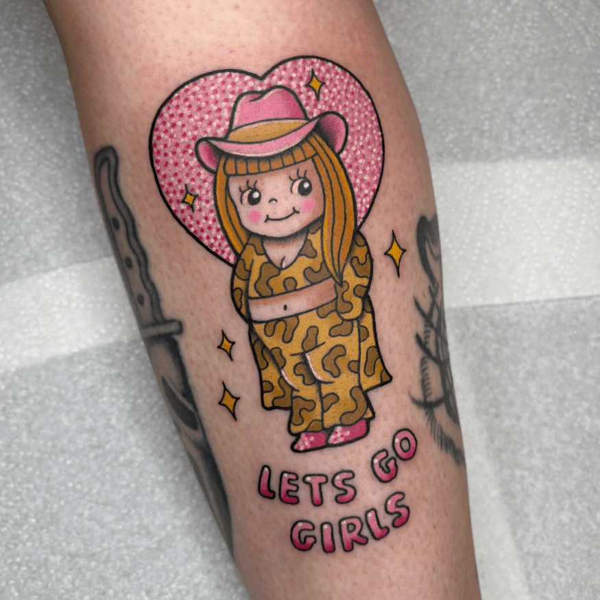 “Let’s go girls” Cute Shania Twain kewpie tattoo by @abbiehoskintattoo