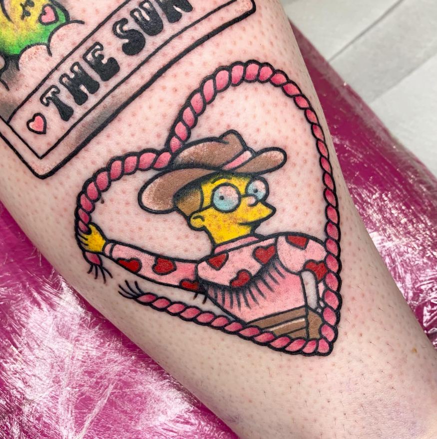 Pink rope love heart and Smithers tattoo by @abbiehoskintattoo
