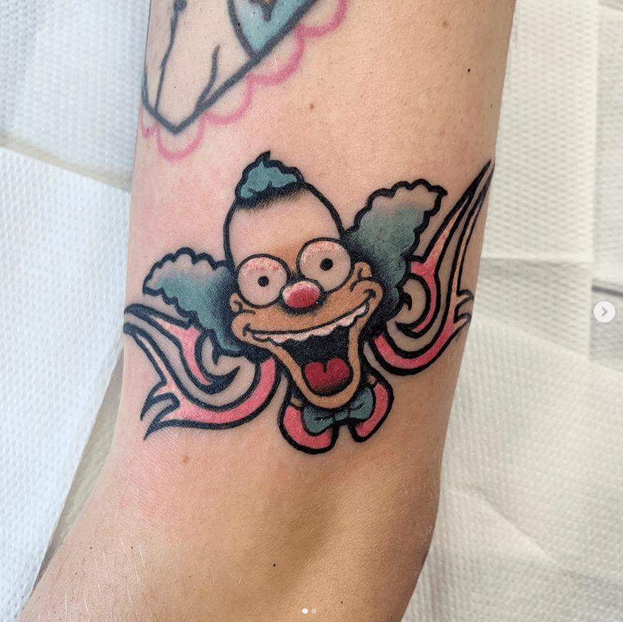 Pink tribal and Krusty the Clown tattoo by @abbiehoskintattoo