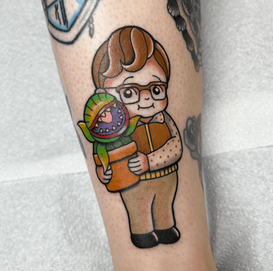 Seymour kewpie and Audrey II tattoo by @abbiehoskintattoo