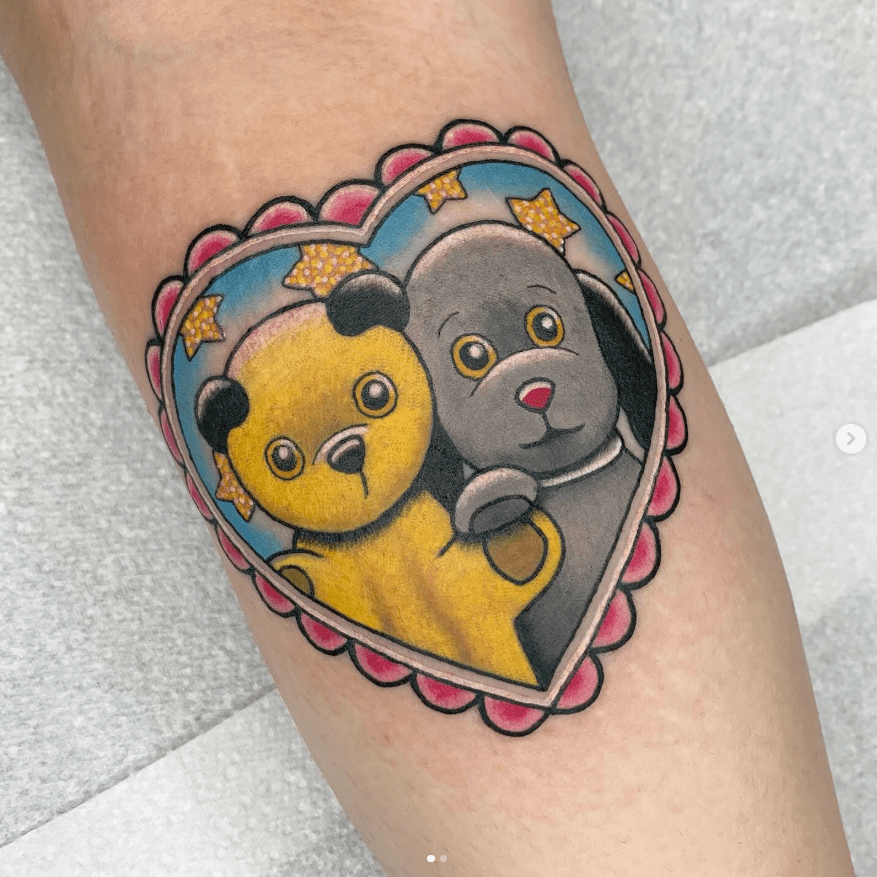 Sooty and Sweep decorative love heart tattoo by @abbiehoskintattoo