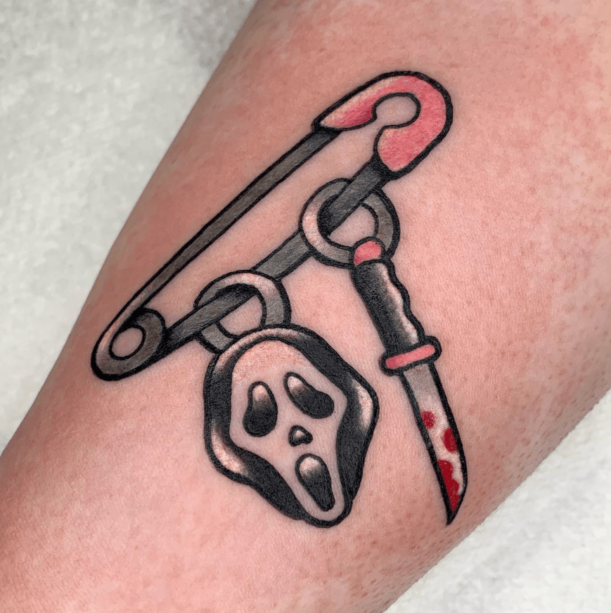 Spoopy Ghostface and knife safety pin tattoo by @abbiehoskintattoo