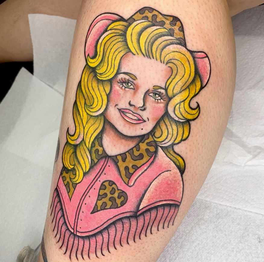 Traditional style pink and leopard print clad Dolly Parton tattoo by @abbiehoskintattoo