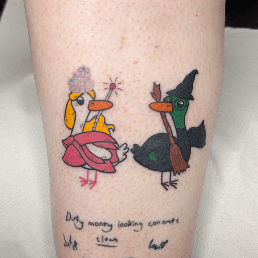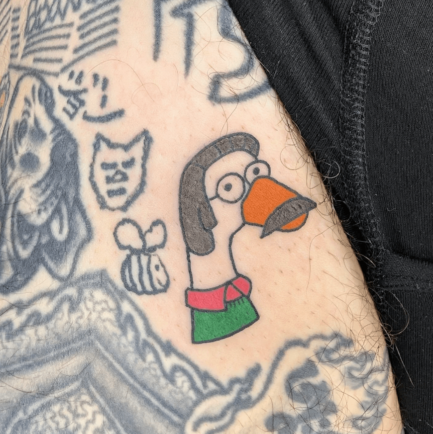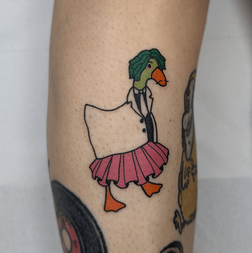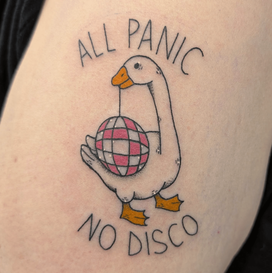 “All panic, no disco” is a repeated design, with elements changed slightly for each client. There’s even tattoos of geese giving tattoos – goose-ception is strong with those pieces.