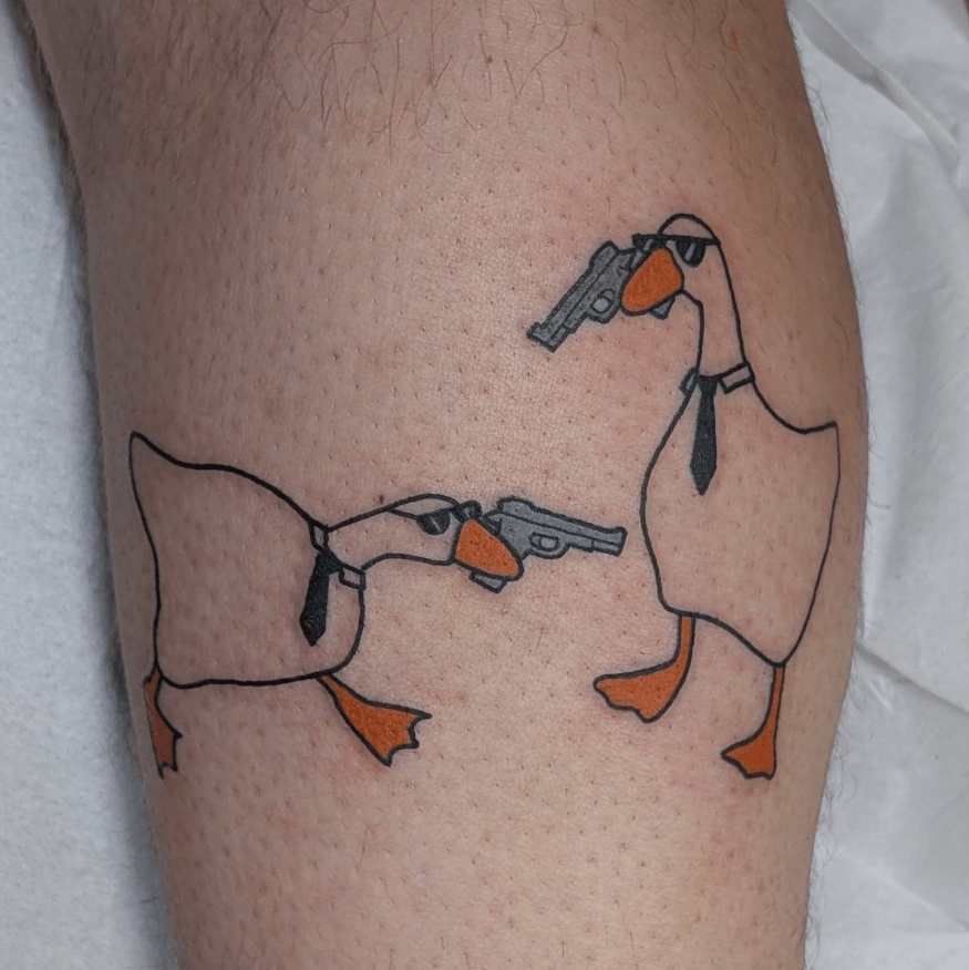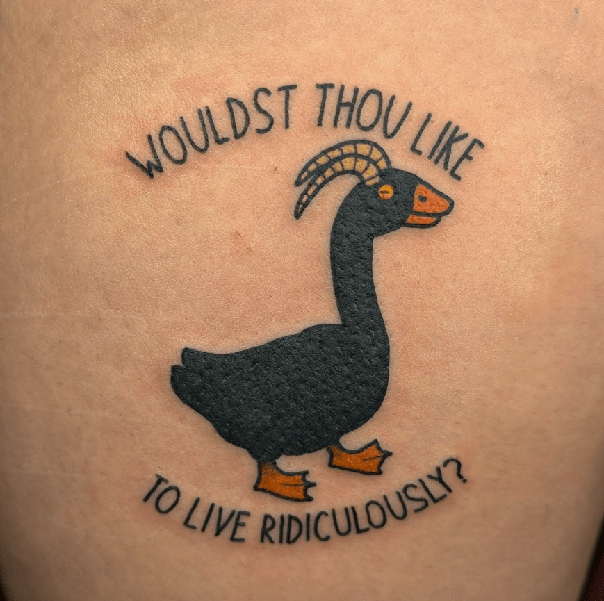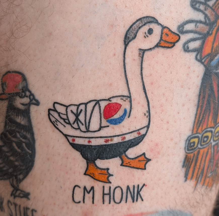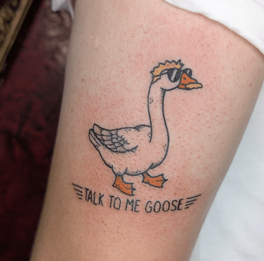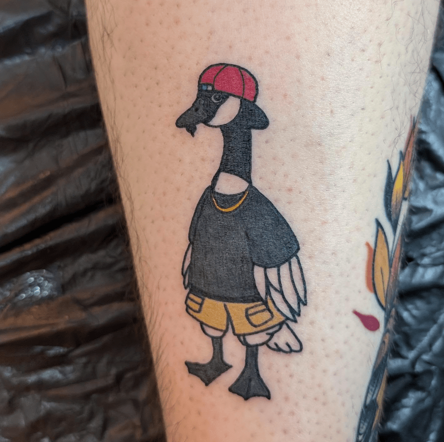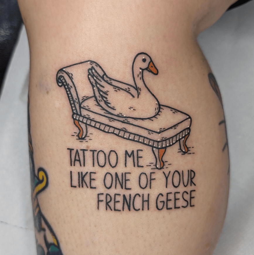 Pop culture references are a common theme in Silas’ work. There’s moments and quotes from classic movies with the protagonist reimagined as a goose, tv characters or musicians styled as geese, or internet memes, substituting in geese. The puns relating to geese (bread/goose/gander/honk) and Silas’ own captions add a further layer of humour to these already silly goose tattoos.
